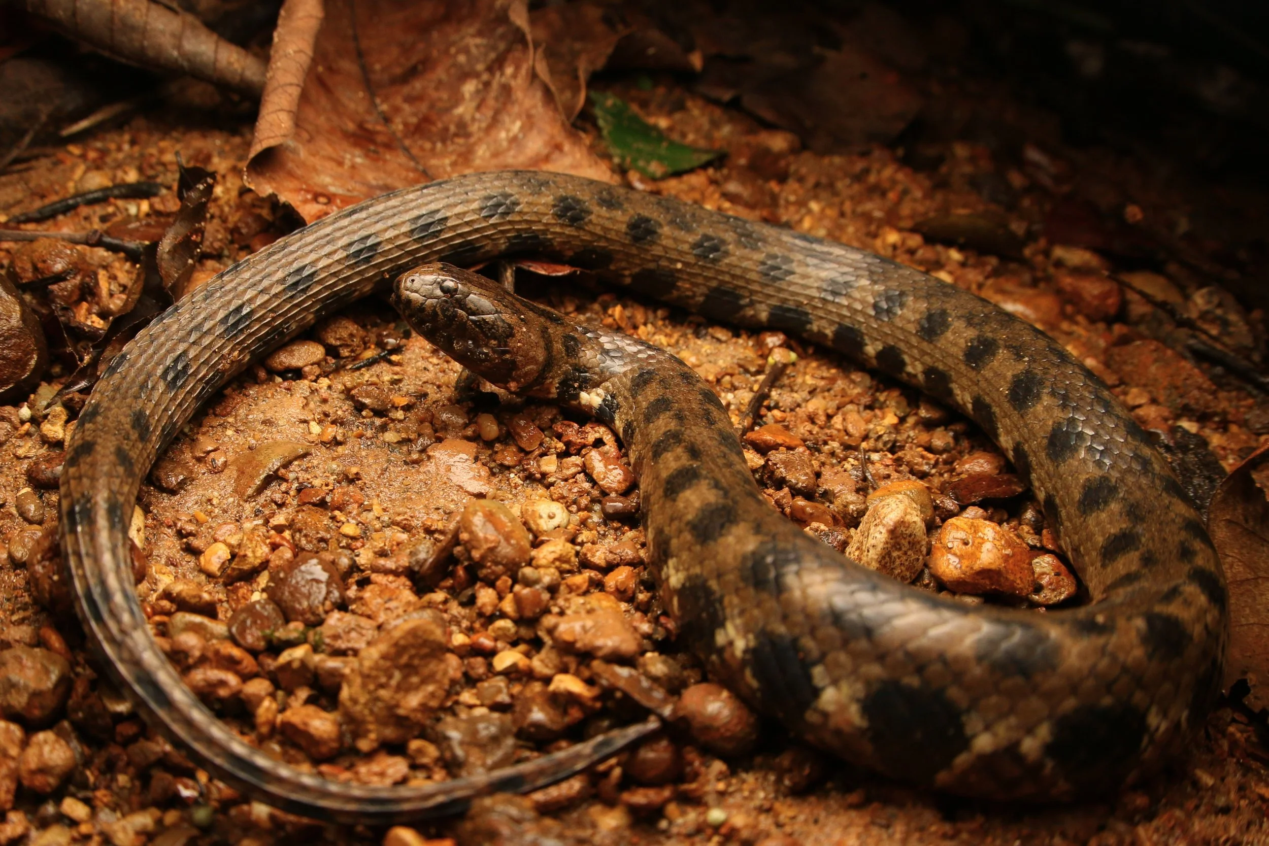 Helicops Hagmanni - The arrowhead water snake is an aquatic species that is active during the night, hunting in streams and swamps exclusively for fish. Even though this species is listed as LC; least concern on the IUCN red list, only six have been found in Ecuador. The last individual was in January of 2026 on Emerald Arch’s land.